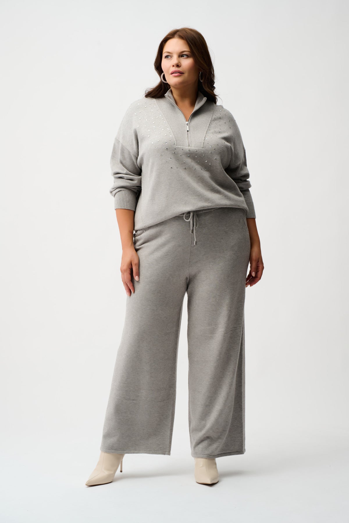 Effortlessly embody casual-chic style with these sweater knit pants, featuring a flattering wide leg, a comfortable pull-on drawstring waistband, and a charming rhinestone-embellished front pocket.