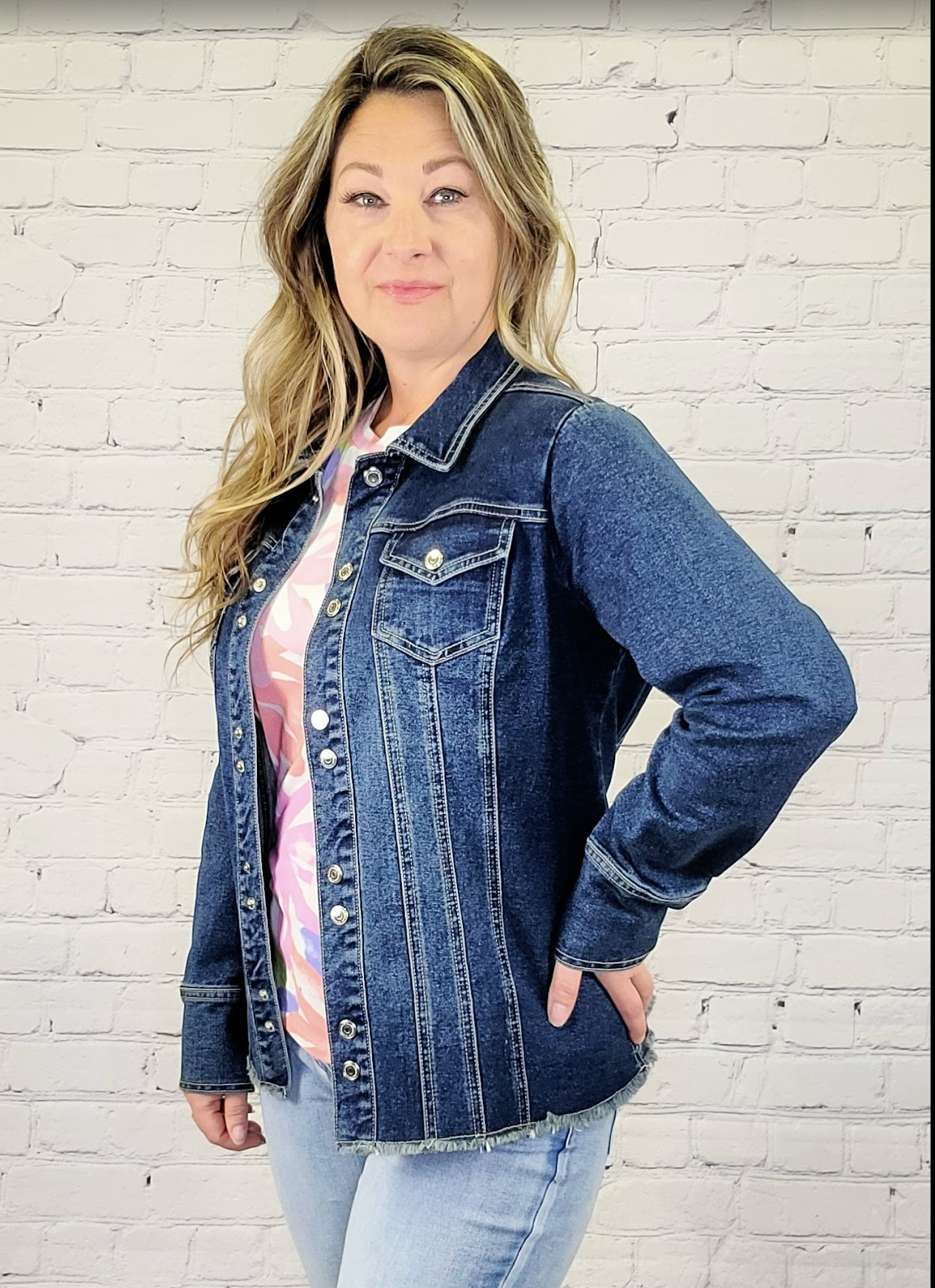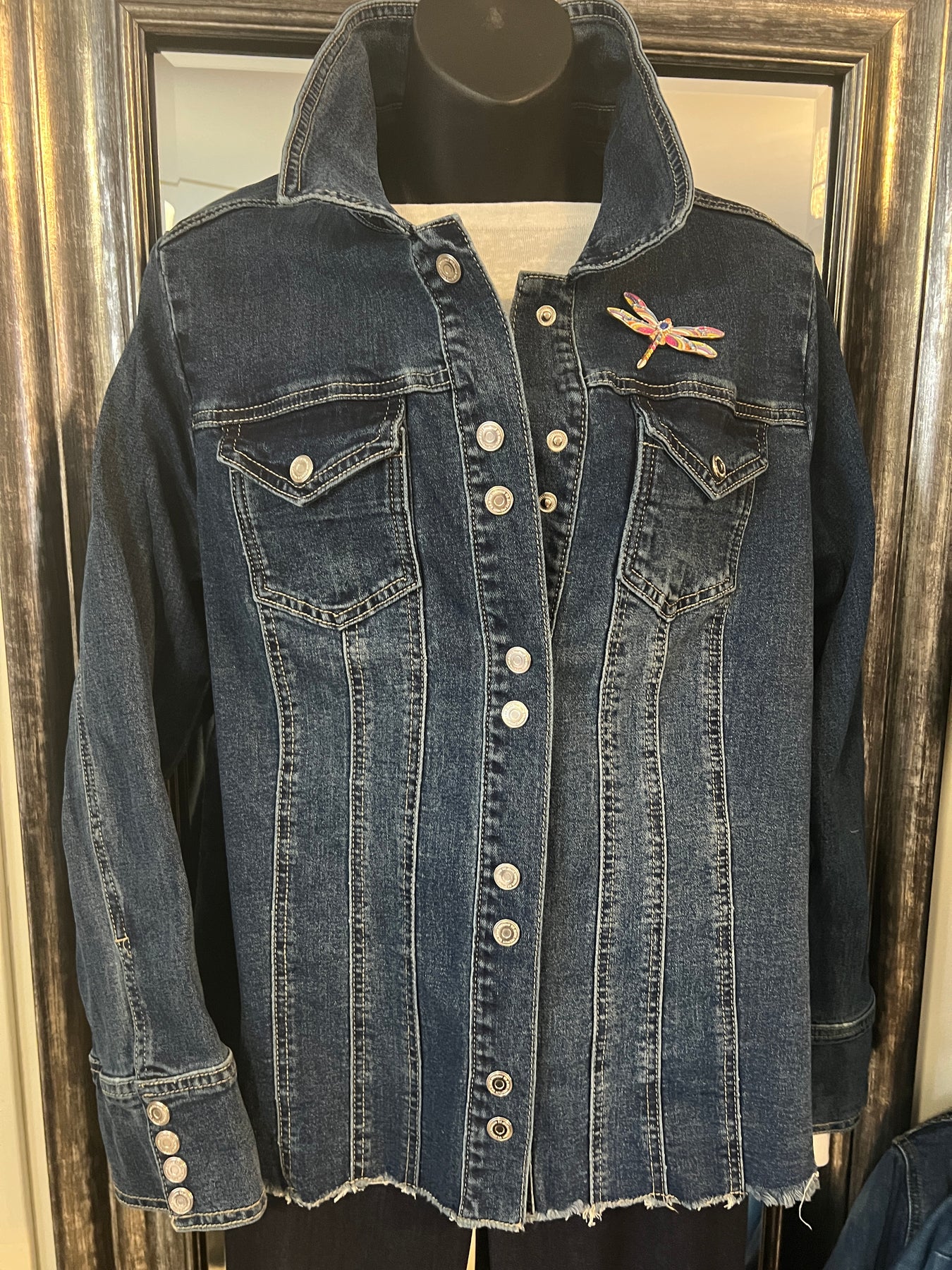 Discover the perfect blend of style and functionality with our Dark Denim long Jacket. Designed to fit and flatter your body, with a longer look and frayed bottom for added edge. Snap details on the sleeve and along the front.