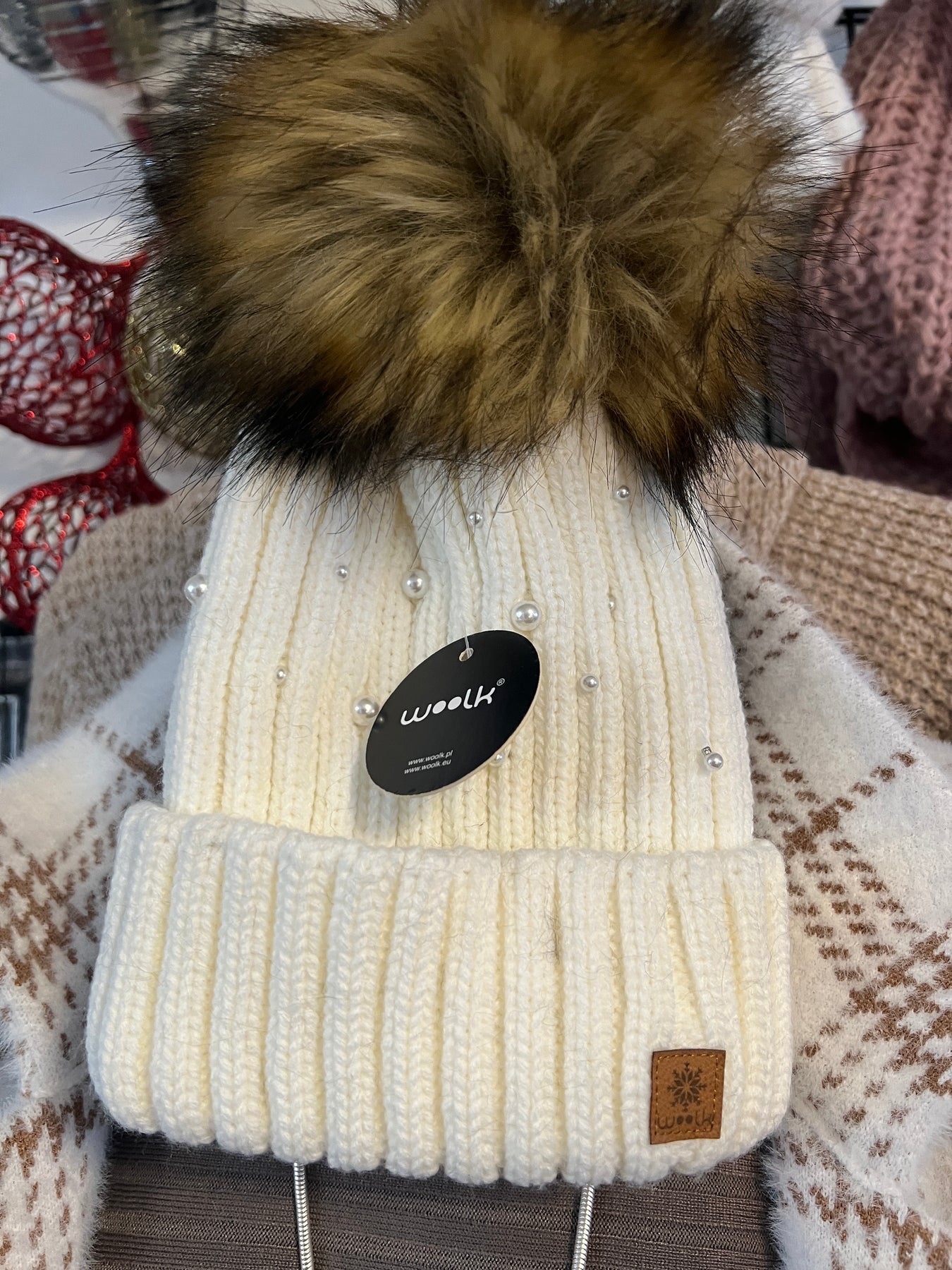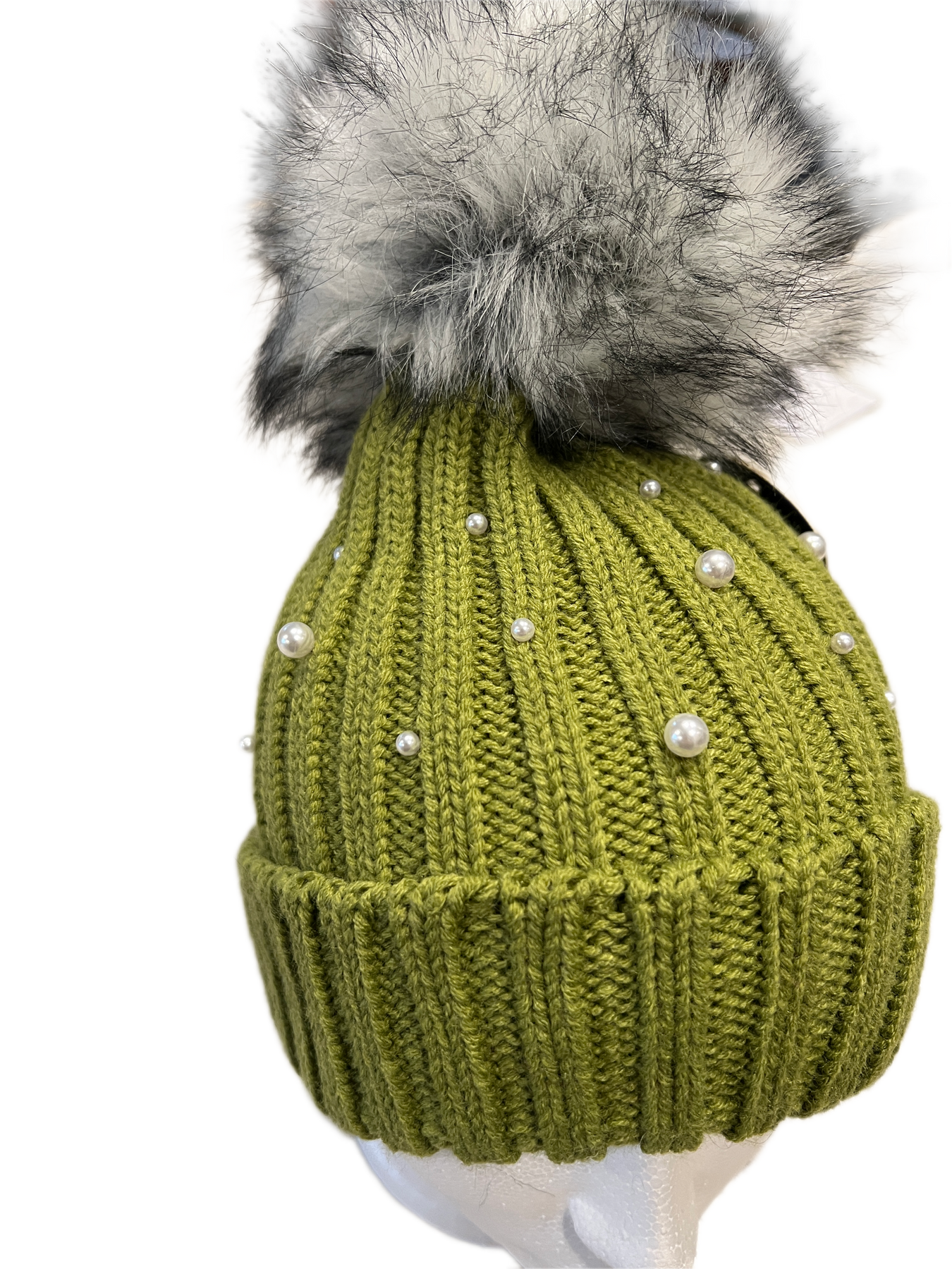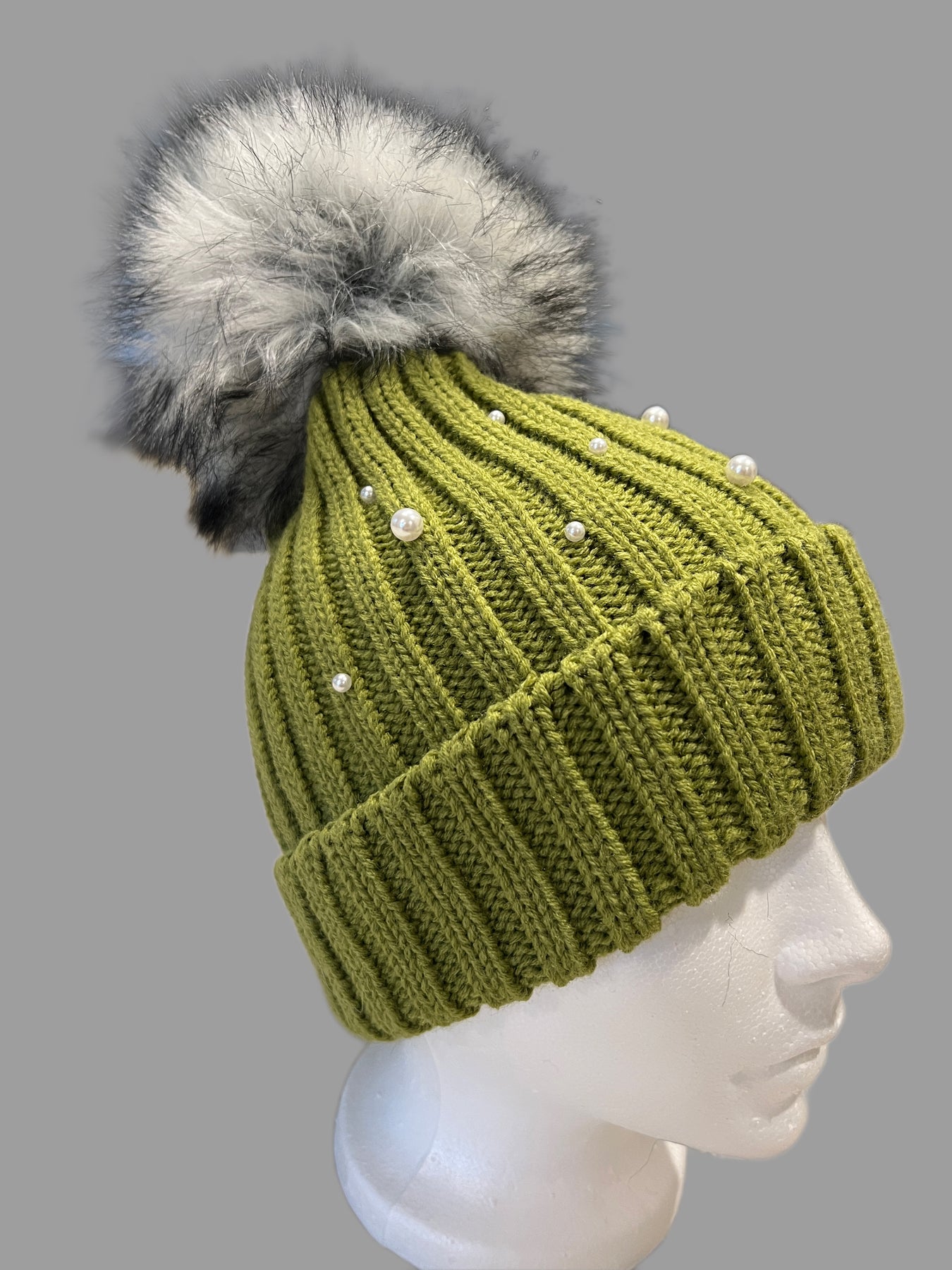 Pearl embellishments on these warm knit pompom hat with warm fleece on the inside.