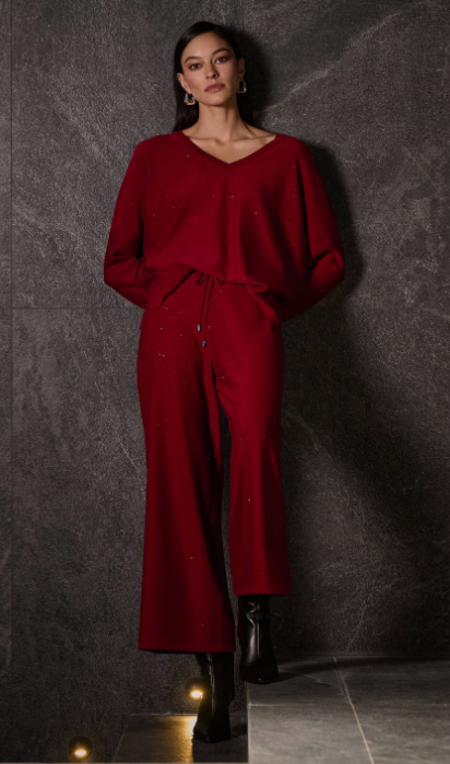 A cozy-chic essential with a touch of glamour. These soft knit pants feature a relaxed, wide-leg design with an adjustable drawstring waist for ultimate comfort. A delicate shimmer thread adds a festive finish without overpowering the look.