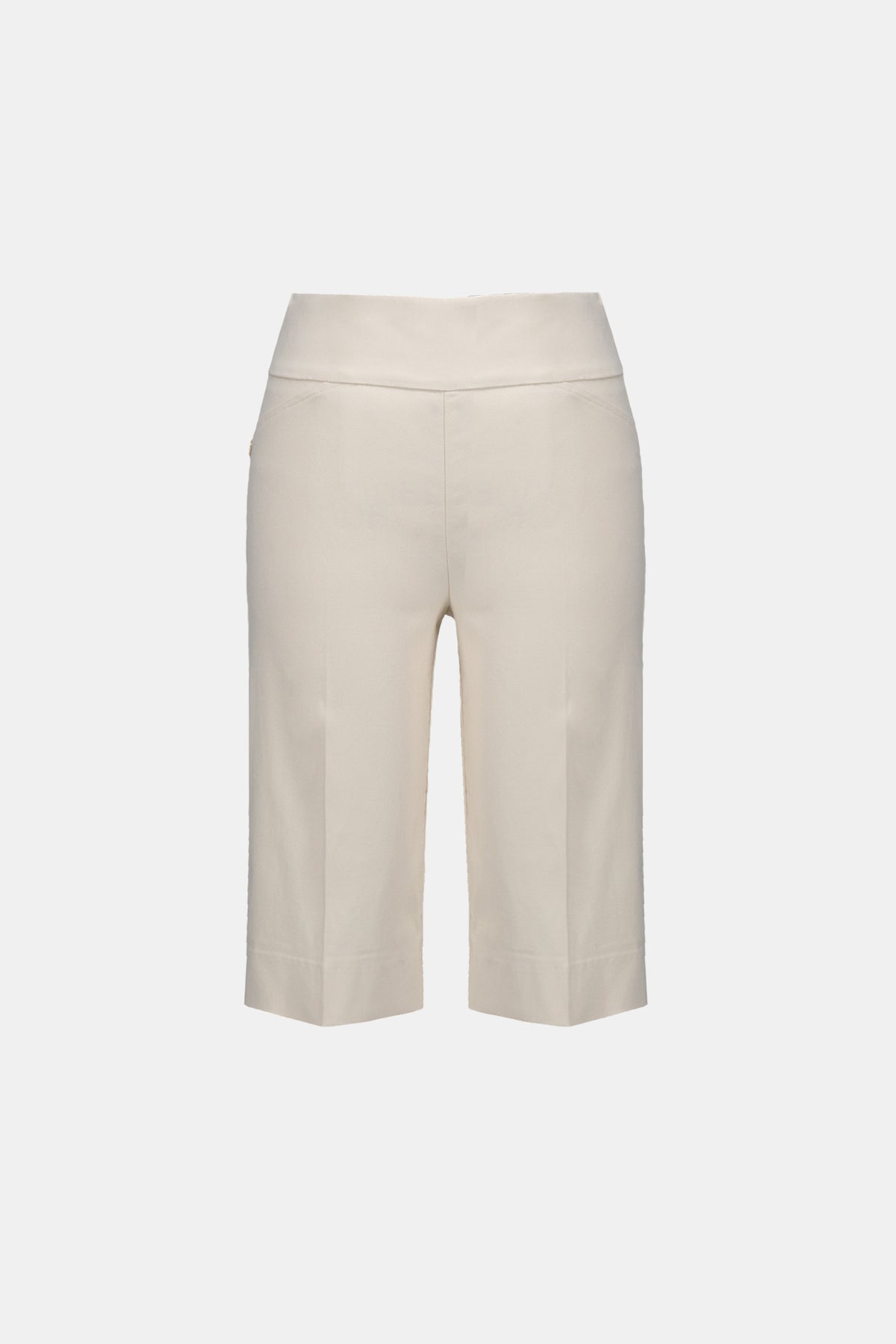 Polish meets practicality in these beautifully tailored Millennium Bermuda shorts. Designed with a structured contour waistband that smooths and supports without bulk, they offer the ease of a pull-on style while delivering a refined silhouette. The decorative front pockets with subtle JR ornament add just enough detail, and the side slits at the hem create movement and comfort for warm-weather dressing.