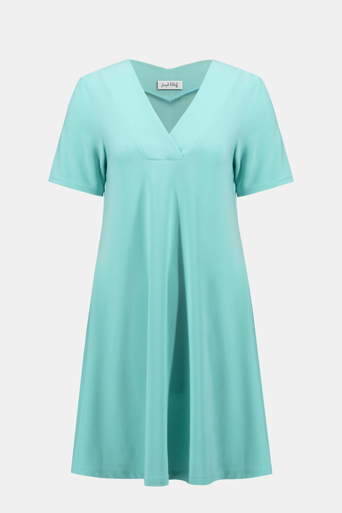 Discover understated sophistication with this Joseph Ribkoff silky knit A-line dress. The flattering V-neckline and short, straight sleeves create an effortlessly polished look, while the mini length keeps things fresh and modern.