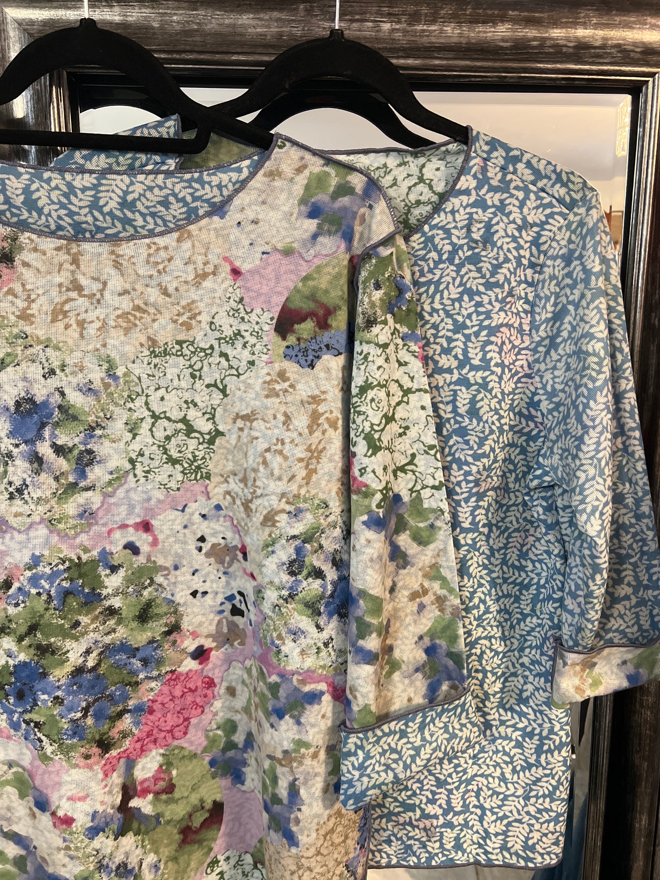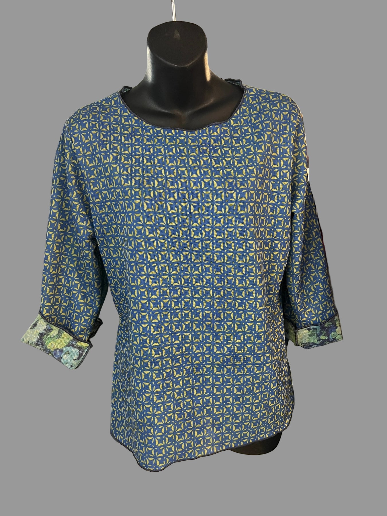 The bracelet-length sleeves provide flattering coverage that sits just above the wrist. When worn on the printed side with exposed detailing, the visible seams add subtle structure and a modern design element. Reverse it for a cleaner, smoother finish with a different pattern.